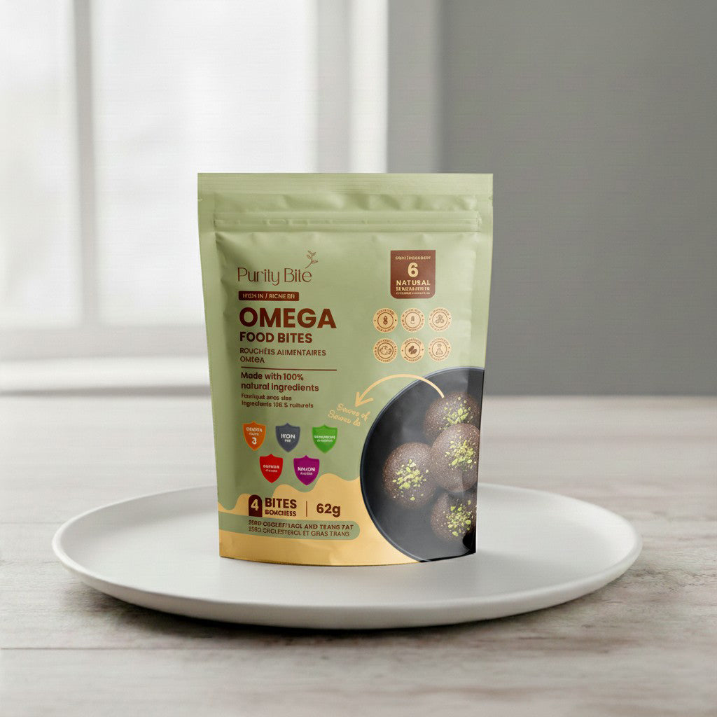 Purity Bite Omega Food Bites are nutritious, all-natural snacks crafted with 100% natural ingredients. Each bite provides a rich source of Omega-3 fatty acids, fiber, and iron — offering a wholesome boost of energy without cholesterol or trans fats. Perfect as a standalone snack, a coffee pairing, or a nutrition enhancer in smoothies and breakfast bowls.