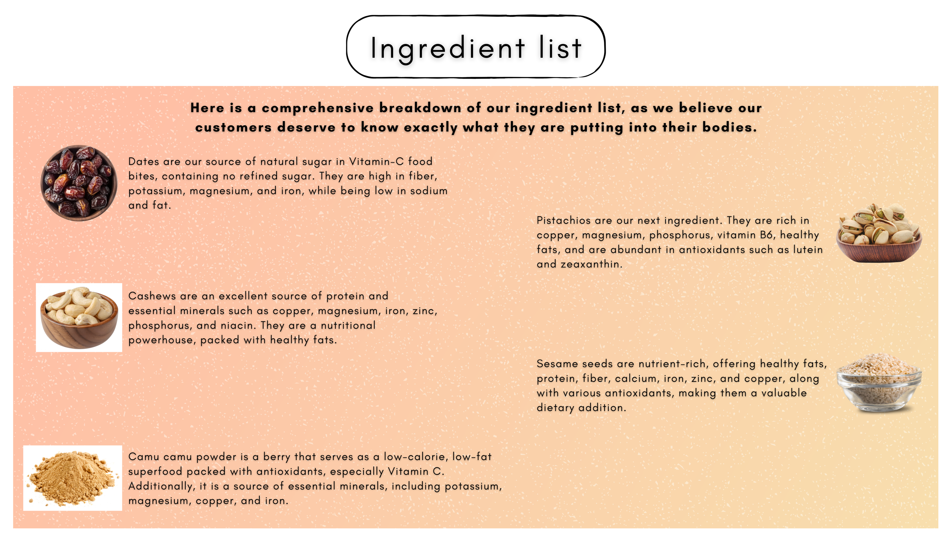 Our food bites are sweetened only with natural sugar sources, ensuring a product free from refined or artificial sugars. Dates are used to sweeten our vitamin-c food bites.